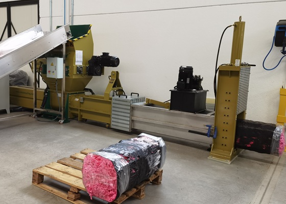 A foam shredder breaks large offcuts into more uniform pieces that can be bagged and stored, reducing volume to some extent and improving warehouse organization.