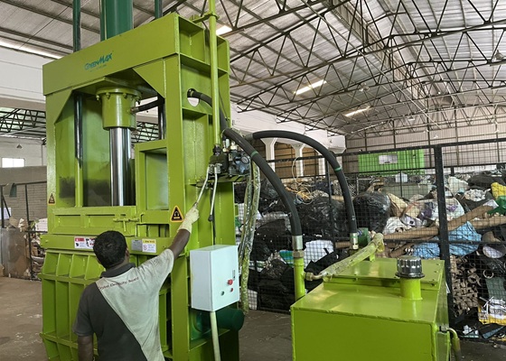 After the GREENMAX PET bottle compactor P-C350 completes drainage/dewatering, a baler is used to turn PET bottles from loose material into deliverable, sellable bales. This step often has a direct impact on the selling price of compacted bales.