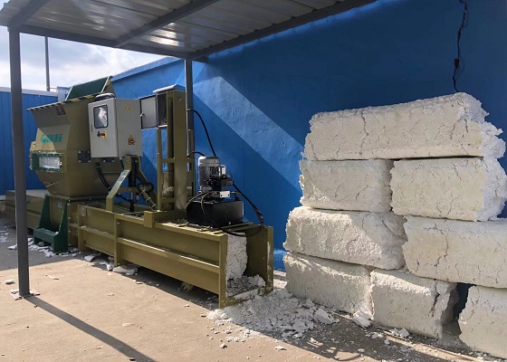Although it sounds amazing, it's very easy to operate. First, you need to collect enough waste polystyrene and make sure that the waste is not covered with tape or other stains. Then you can turn on the polystyrene compactor and press the boot button in turn to start the machine, and then throw the waste polystyrene into it. When these loose polystyrenes come out, they will be compressed at 1:50 and become blocks. Here the polystyrene compression part is over, and next is the process of polystyrene becoming a substitute for wood products.
