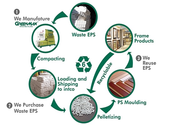 Through in-depth cooperation with domestic and foreign polystyrene recycling points, the establishment of the global renewable polystyrene recycling network, INTCO continues to reclaim large quantities of renewable polystyrene. Meanwhile, INTCO applies advanced polystyrene regeneration technology and regeneration polystyrene product development technology to achieve polystyrene recycling, and form a circular economy model.